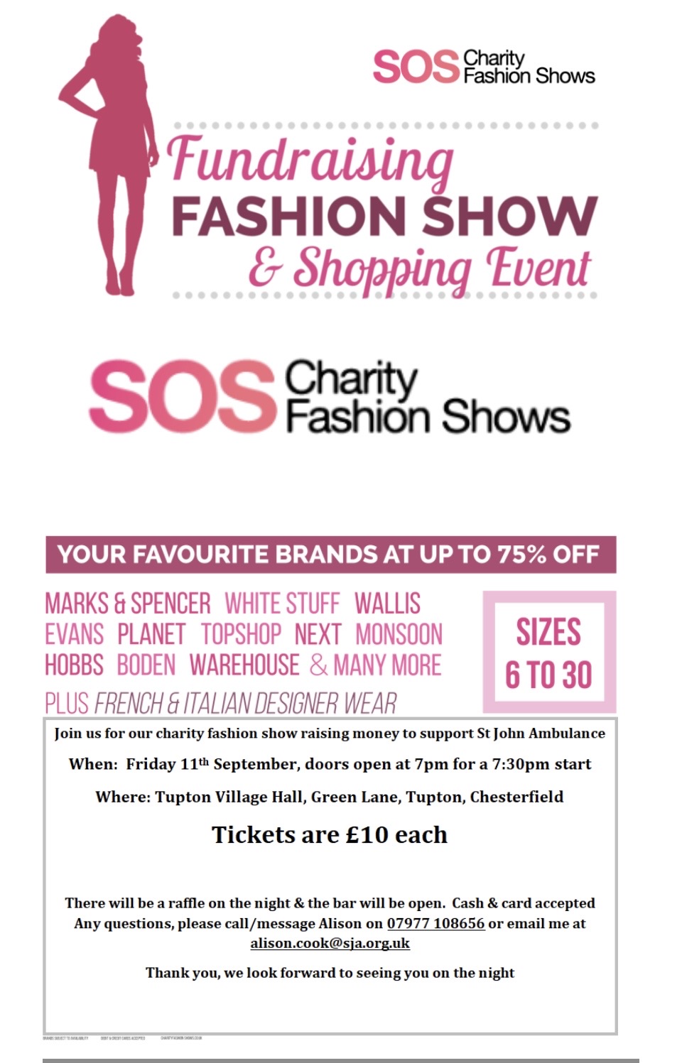 Join us on Friday 11th September for Charity Fashion Show & Shopping event at Tupton Village Hall, Chesterfield. Your favourite high street brands including M&S, Next, White Stuff, Dorothy Perkins and many more at hugely discounted prices.